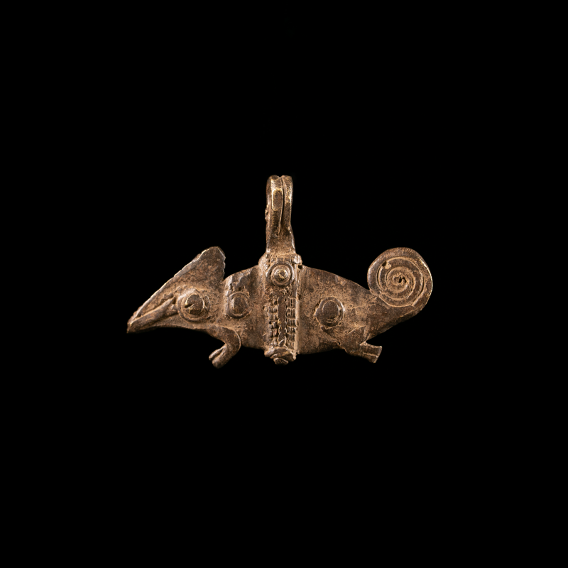 Rendered in a refined and stylized manner, this zoomorphic sculpture captures the essential characteristics of the chameleon. The elongated head and prominent eyes evoke its unique ability to observe its surroundings with precision, while the body is structured along a central axis, giving the piece a strong visual balance. The tail, shaped into a spiral, departs from naturalistic depiction but reflects an important symbolic language found throughout African art.
