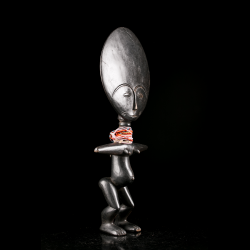 Carved from light, patinated wood (as seen here with this black patina), they represent a stylized woman with a disc-shaped head, cylindrical neck, reduced arms, tubular body, and ritual scarifications, particularly on the back of the head, where the motifs are not chosen randomly but follow a precise set of codes.