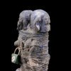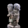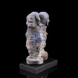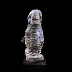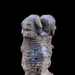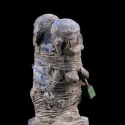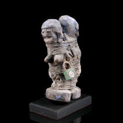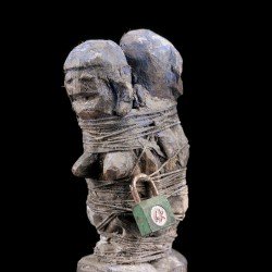 A pair of wooden figures, one male, the other female, bound together. The facial features of each figure is fairly schematic showing a straight line for the brow, small, pellet shaped eyes, small nose and large open mouth displaying a row of teeth. Each figure has large, pendulous ears. The female figure has prominent breasts and bot stand on a small, round base. The figures are bound to each other with strips of leather and twine, and there is a padlock to one side secured through the twine. The whole surface of both figures has accretions from the application of ritual substances.