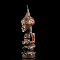 Frontality is usually observed; but a few rare effigies turn their heads to the side. The faces are powerful, the eyes half-closed or made of inlaid cowries. The nose is triangular or diamond-shaped. The mouth is slit-shaped, sometimes crescent-shaped. The chin is prominent. The statues are sometimes enhanced with copper, nails, pearls.