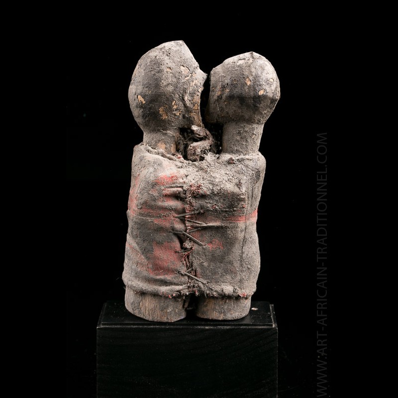 African fetish from the Fon. We occasionally find fetishes made up of two entwined figures, attached by ropes or pieces of fabric. Classically, we observe a thick crusty patina obtained as a result of repeated libations made by the diviner and his client using chicken blood, other animals and various decoctions whose ingredients are kept secret.