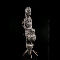 This African statue comes in the form of a slender figure resting on a conical base. To hold the fetish in place, the fetishist added a set of nails that act as feet. Traditionally, accessories and elements have been added to the body and legs, held together with tight ropes. Remarkable element on this piece, the presence of a skull firmly fixed on the back of the character. This is an infrequent addition, adding significant magical power to the room, especially as part of anti-evil spells.