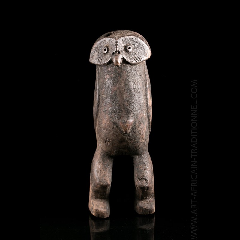 African statue depicting an owl, an animal present in the Lega culture. This type of figurine, like the other "Iginga", was used in African art as part of the Bwami initiation which instilled in every Lega individual the foundations of morality and social order. As part of this initiation, the senior officers taught young recruits, men and women, precepts using traditional objects such as small and large masks (Lukwakongo, Idimu, Muminia, ...), figurines of wood, bone or ivory. We will not fail to notice the phallic shape of the piece, linking wisdom and masculine power.