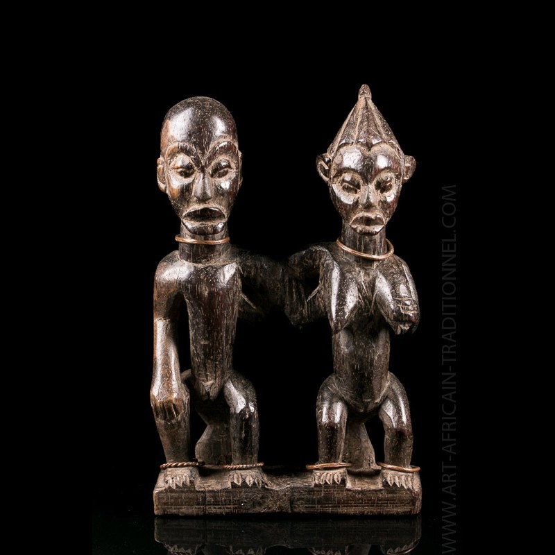 This couple of African monoxyle statues is connected by the base as well as the interlacing of their arms in the back. It is a type of figure of Bakongo-Manyanga origin, in this case, dedicated to the Lemba cult.