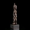 Authentic male Luluwa statue, the wear and patina thereof testify to repeated ritual manipulation and use. The hair is pulled in a horn shape at the top of the head. The face is broad with large almond-shaped eyes, a small nose and a small mouth, with a pointed chin that can represent a beard. The thick collar is incised with a series of small squares to represent a necklace. The body has a swollen belly with a large navel and on the chest and upper arms there is a series of geometric patterns engraved to represent scarification marks.
