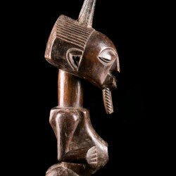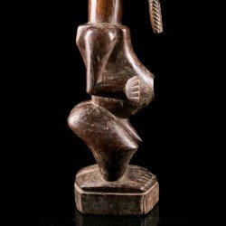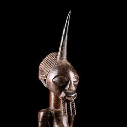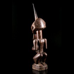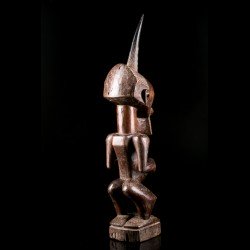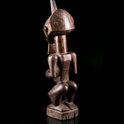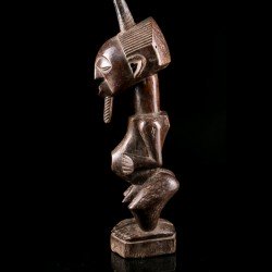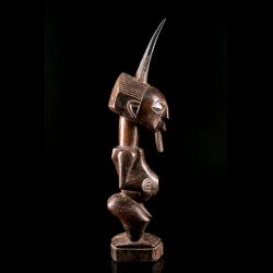 This African statue of Songye origin is a desacralized nkishi fetish except for its ritual horn, stuck at the top of the skull. The body initially housed accessories such as saddlebags, skins, bracelets and anklets giving it its protective power.