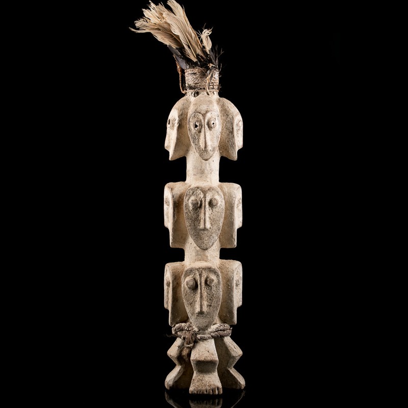 This four-faced figure represents Sakimatwematwe, Lord of many heads. The multi-headed, multi-fronted figure is often used in Lega art. It is not related to the representations of Janus in ancient Rome or to the concepts of ambiguity and hypocrisy. Sir many-heads saw an elephant on the opposite bank of the great river Lwalaba. The text conveys the superior knowledge and insight of the high ranking initiate. He sees and knows things unseen and unknown to others. He applies his sense of justice as an arbiter between young and old, male and female, initiated and uninitiated, good and evil.