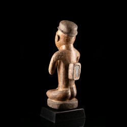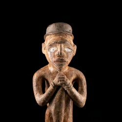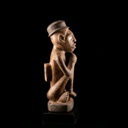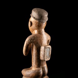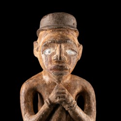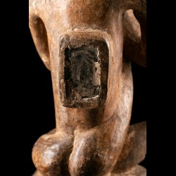 This statue is a major piece of Bakongo art. The character is represented seated, legs at right angles, hands joined under the chin. The eyes are encrusted with glass that breathes life into the character. On his head, a colonial-style headgear. The patina is clear. In the back, a surprising still sealed cavity intended to contain the magic charge. The mirror covering it should allow the diviner to detect the approach of the sorcerers and protect themselves against it.