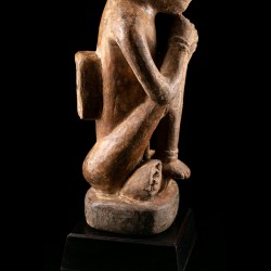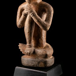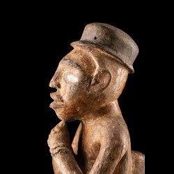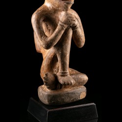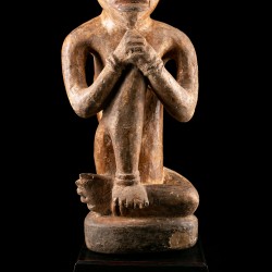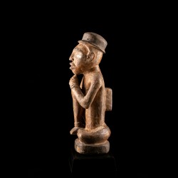 According to the codified gestures of African art Kongo, the character rests here on a base consisting of a rough piece of wood called kinkulu. The position is that adopted in debates aimed at solving problems and is called sendama. The individual or the leader calls on the ancestors to give him attention, thus stooping before their authority. A vocabulary finely details the various postures of Kongo statuary.