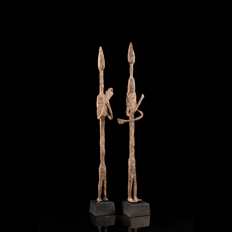 The art of the Dogon blacksmiths is materialized in figures of ancestors such as these, with slender bodies.