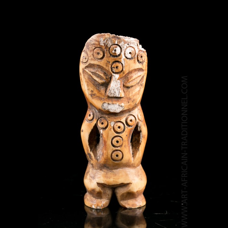 In African Lega art, there are a multitude of types of figurines, statuettes and masks related to the Bwami initiation that governs the social and moral order in their traditional society. Among these objects, the Kalimbangoma, small figures in bone or ivory representing sometimes humans sometimes animals. Here, the tribal character looks quite classic presents small circular patterns characteristic. This Lega art collector's item was owned by a high-ranking Bwami, typically a Lutumbo lwa Kindo or Yananio.