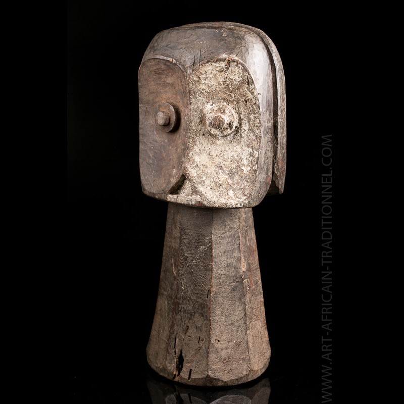 African Bembe statue Mishi with two highly stylized faces, carved identically. They offer a structured face in oblique planes by the thin median ridge stretching from the top of the forehead to the end of the nose, animated by the tubular eyes projected in high relief. The faces are separated into two concave faces inlaid with red and white pigment. The base is frustoconical.