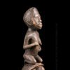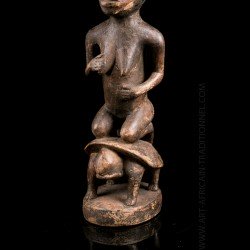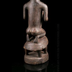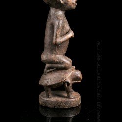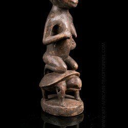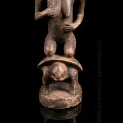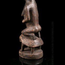 Here, a statuette depicting a kneeling woman, hands close to the chest. It is carried by a turtle, a totemic animal sometimes represented in this art. A copy of a piece with a similar theme is on display at the Royal Museum for Central Africa in Brussels. The patina is relatively clear. Despite the small dimensions of the room, we can observe the most attentive work of sculpture with surprising realism.