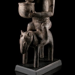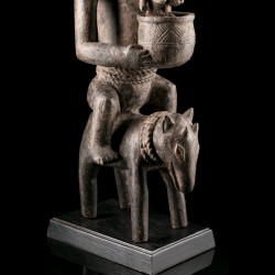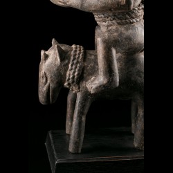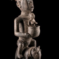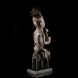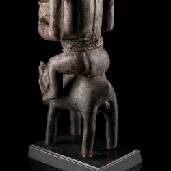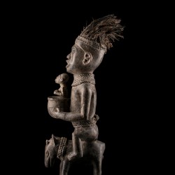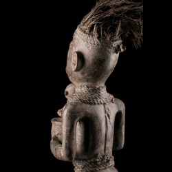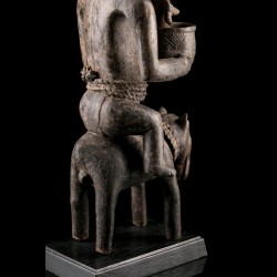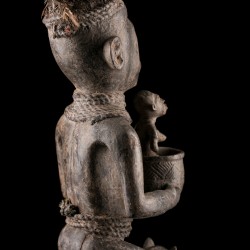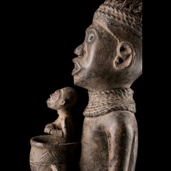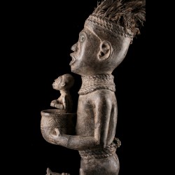 The headdress is made up of feathers held together with rope, as is traditionally the case on some of the most popular minkisi. Finally, a very unique element, the main character holds in his hands, in front of him, a container in which a smaller character is installed.