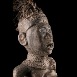 This piece, of Kongo Vili origin, on the west coast of the former Zaire, takes up the stylistic codes of the ethnic group, including the naturalistic face with an open mouth and detailed teeth. Glass is stuck in the eyes and the pupils are detailed in the center of the sclera.