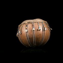 Calabash drums decorated in this manner are common among several ethnic groups such as the Yoruba, Bamiléké, and other peoples of West and Central Africa.
