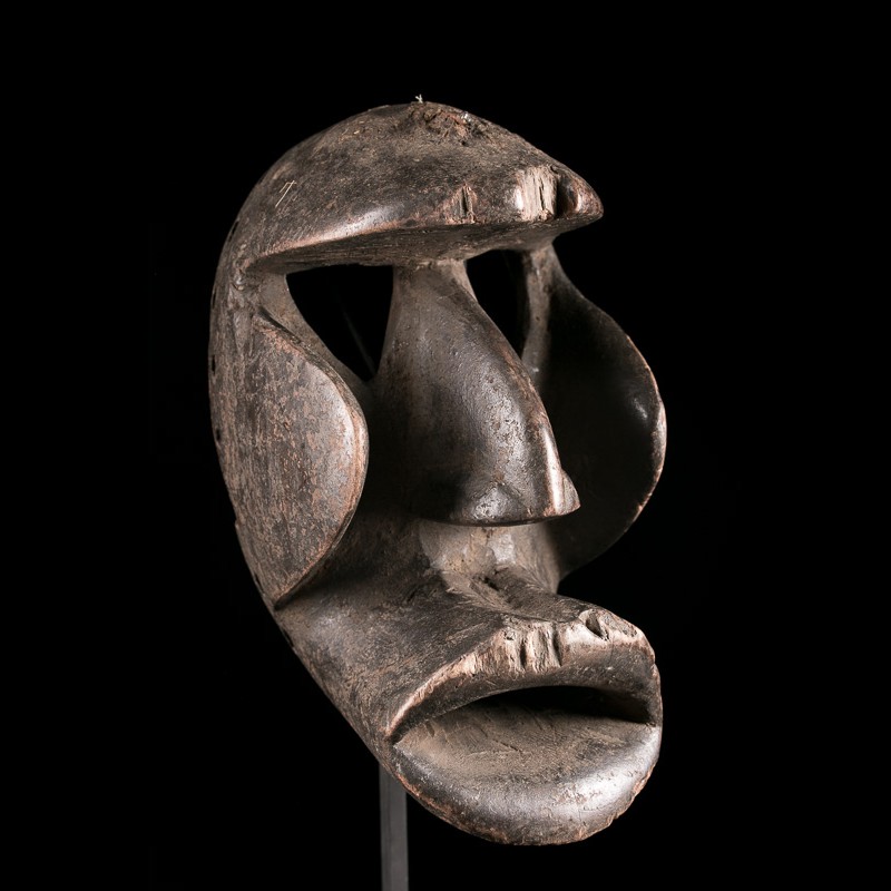 A wooden mask with exaggerated and grotesque features. The forehead is dome shaped above eye holes in the shape of inverted triangles. The cheeks are two semi-circular wings to the side and the nose is large and hooked with flared nostrils. The mouth projects forward and is open with fleshy lips. The sides of the mask are pierced for the attachment of a separate raffia beard.