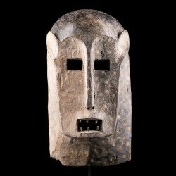 This wooden mask, made from a dense, fine grained wood, displays a geometric forms typical of the Kumu people. The mask has a rounded forehead and the brows are high and arching. The eye holes are small and square with the nose being long and straight. The mouth is also square shaped and has small pegs of wood to represent he teeth. The left hand side of the mask is painted in black pigment with a series of lighter pigment dots to the surface.