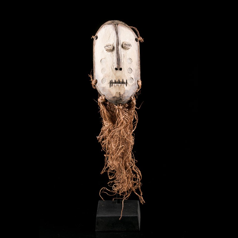 Small African mask covered with a kaolin patina. He still wears his little raffia beard. Masks such as this, carved by the Lega, were not intended to be worn on the face but to be held in the hand or placed on ritual panels. This specimen belongs to the Lukwakongo type.