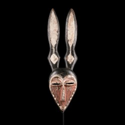 This traditional Pende mask is one of the stylized objects typical of African art. Her little face is slender and adorned with geometric decoration based on white and red pigments. At the top are not horns or ears but knives symbolizing the chief's weapons.