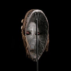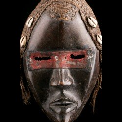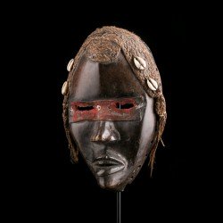 The stretched, almost closed eyes are integrated into a band of red pigment, as is often seen on Dan masks. The headdress is finely crafted, with two pretty braids falling delicately, and small cowrie shell ornaments can be seen. The Zakpai mask, quite similar to the Gunyéya, differs from it in that it has a red cloth glued over the eyes. It acts against forest fires that appear during the dry season.