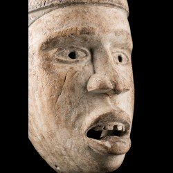This kongo ngobudi mask would probably be the idealized portrait of a powerful leader, possibly even that of the mythical founder of the Kongo kingdom. This mask danced during festivities, which originally praised the character depicted.