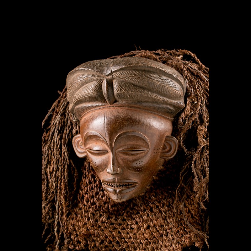 The headdress that accompanies the mask is still well attached to it. Indeed, the man who wore this female mask of the mwana pwo (beautiful woman) type was hidden by a headdress and a rope costume, generally lined.