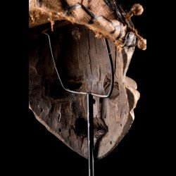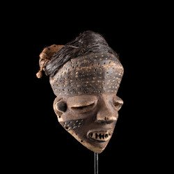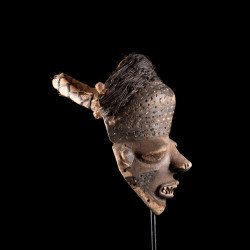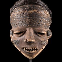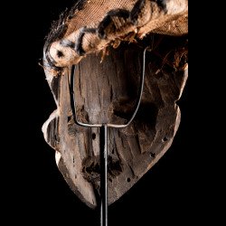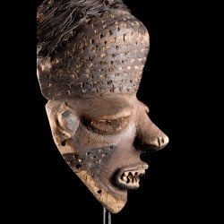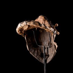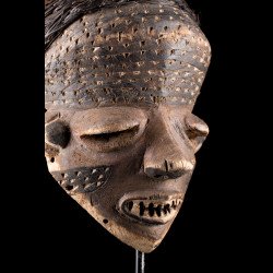 Traditionally, African mbuya masks such as this one were danced during the mukanda, the initiation of young men from puberty to adulthood. Today, these masks still dance, but they are desecrated and brought out for secular village festivities. The masked dances of the Bapende are a true comedy played in several acts.
