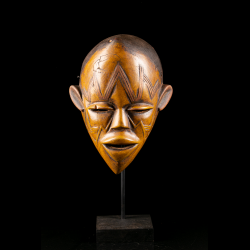 This traditional Tanzanian likomba mask with a lustrous patina and a face decorated with body art could be accompanied by a so-called "belly" njorowe mask representing the swollen abdomen of a pregnant woman.