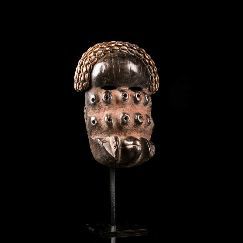 The hairstyle, carved in volume and encircled by a thick braided band, crowns the face and enhances the overall balance of the composition. The narrow, pierced eyes and the strongly stylized mouth contribute to a tense, almost threatening expression, typical of masks intended to intervene in contexts of social control, justice, or communal protection.