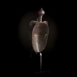 Sculpted with elongated elegance, adorned with delicate horns, and sometimes surmounted by a guardian bird, it appears during the ceremonies of the Poro, an initiatory society that structures the transmission of knowledge.