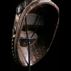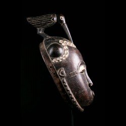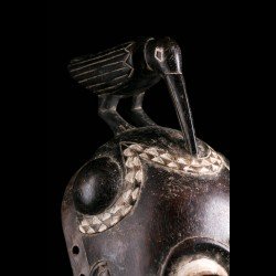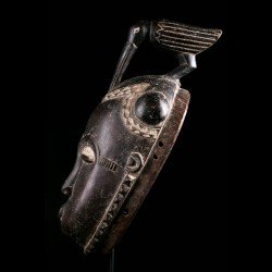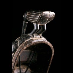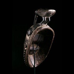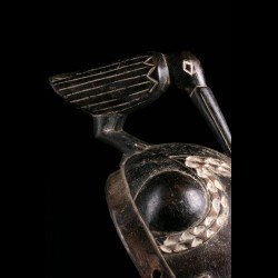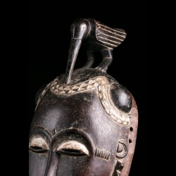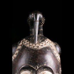 Yohouré pieces are nonetheless quite original and have their own characteristics. Among these, we can note the presence of a frontal headdress whose edge is finely worked and symbolizes wealth. This piece also has a very beautiful symmetry. The eyebrows arcuate circle and meet on the bridge of the nose. Yohouré masks are also famous for their crest ornaments. Here we find a representation of a bird leaning forward.