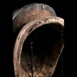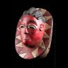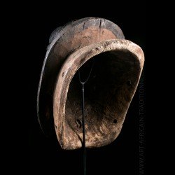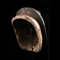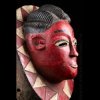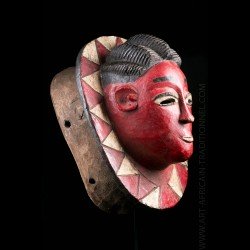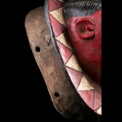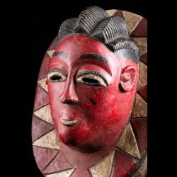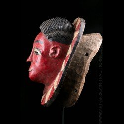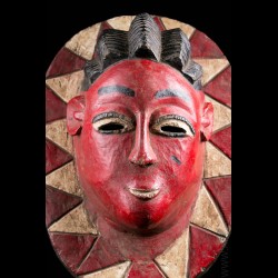 African masks from the Gouro ethnic group in Ivory Coast are often very colorful. This one does not escape the rule and presents a bright red patina on the face. The head is presented on a tray itself decorated with colorful geometric patterns.