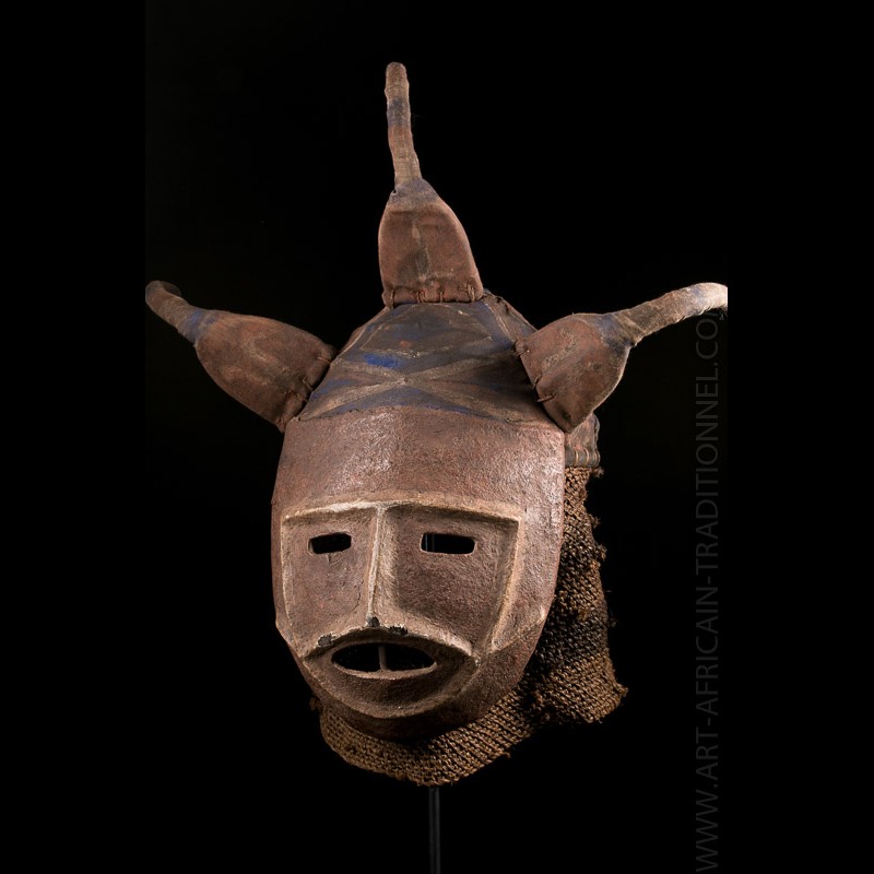 This ancient African mask is composed of a covered wooden structure. The facies is simple and typical, of superb quality and very well preserved. The braided headdress was accompanied by a full costume based on the same two-tone patterns.