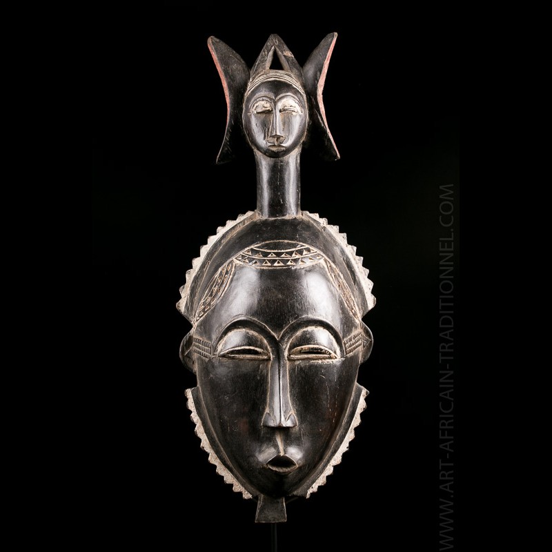 In African art, Baoulé and Yohouré or Yaouré used several types of masks. This traditional mask represents a human head with characteristic scarifications on the temples and an elaborate hairstyle, does not seem to have a sacred function.
