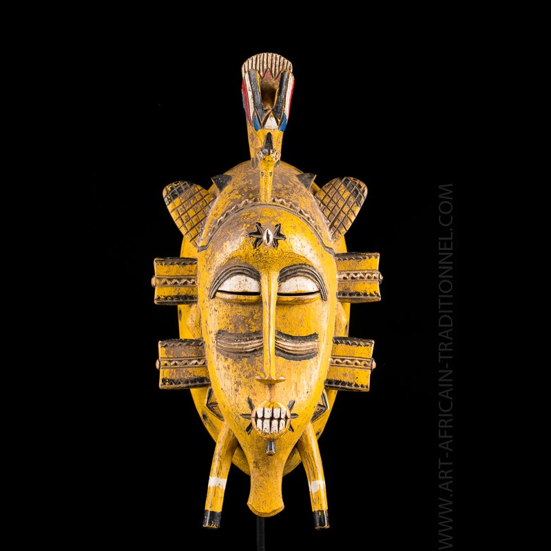 African mask Kpeliye type carved by a Senoufo artsite in Ivory Coast. It is exceptionally covered with a colorful patina that shines the wearer during Poro dances.