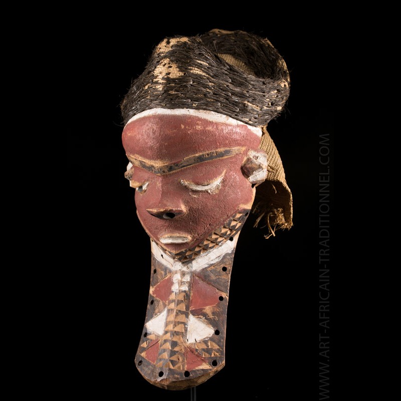 Traditional African Mbuya masks like this one are used to entertain a community at non-ritual feasts. Formerly used at mukanda initiation ceremonies to mark the end of the rituals of male circumcision, mbuya masquerades are now aimed at highlighting a number of characters and roles in the Pende society. There are two main groups of masks used at festivals.