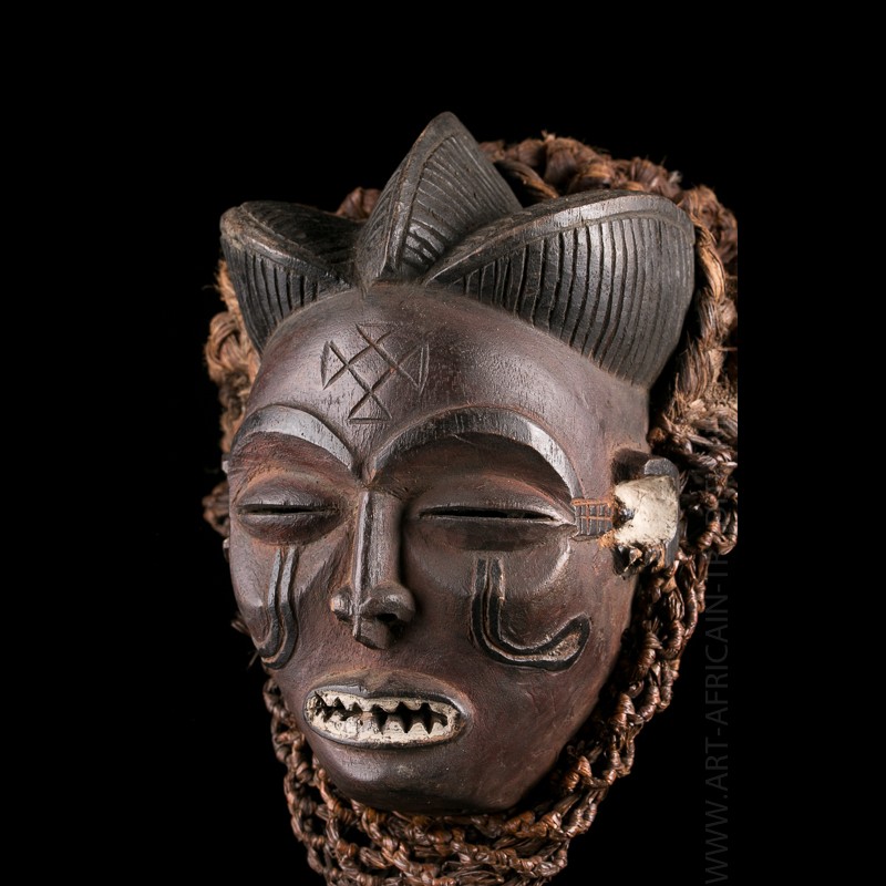 Chokwe African mask from the collection of a Belgian family who lived in southern Congo at the time of independence. In African art, we know the famous masks of beautiful young woman Pwo or Mwana Pwo among the Chokwe. These are female masks worn by men that simulate the behavior of a woman in the prime of life. Here, a triple headdress very fashionable in the first half of the 20th century. The patina slightly turns red. There are many scarifications on the forehead and under the eyes. The rope headdress, as is customary, is still very present. Beautiful state of conservation. The trimmed teeth are encrusted with white pigment in order to stand out from the face.