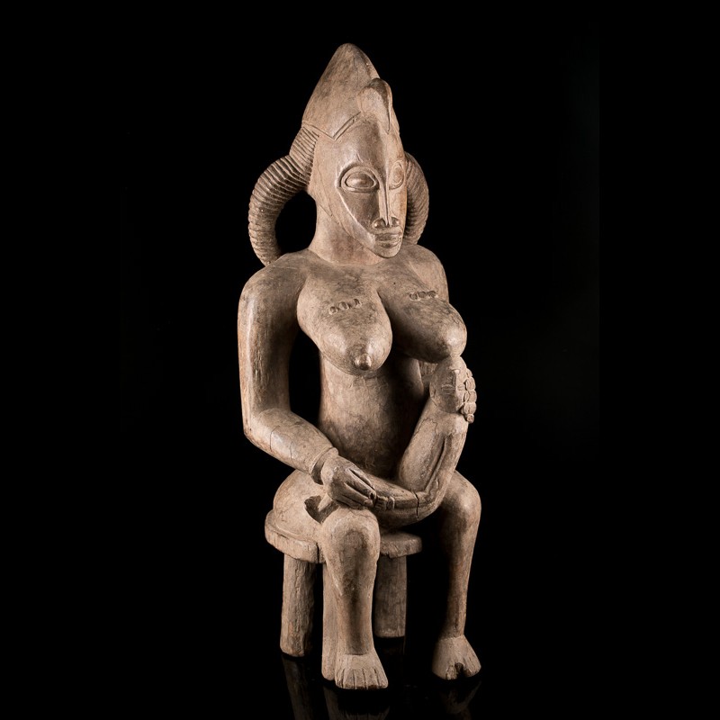 Among the Senoufo, childbirth is celebrated through superb statues of maternity such as this one bearing the name of Katyelo. They are usually represented seated, carrying the child in the arms or giving him the breast of a generous chest as seen here.