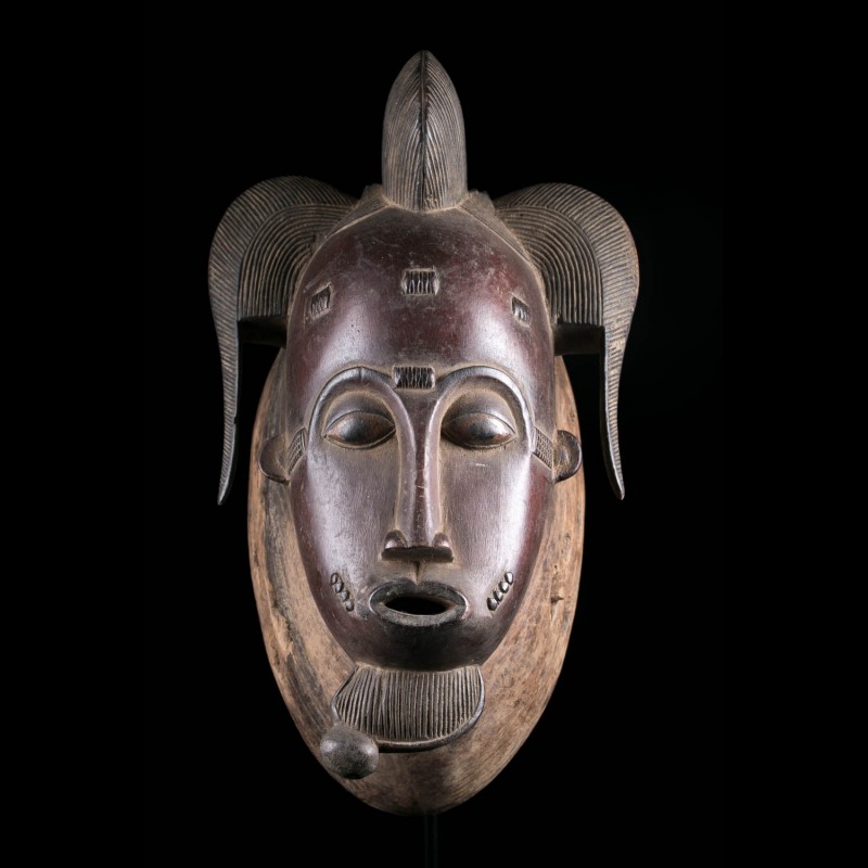 The kpwan mask represents a woman's face, in spite of certain features: on the chin, a goatee extends the face downwards, suggesting a hermaphrodite character. While the bulging forehead is crowned with a complex hairstyle composed of mats falling to the side. Scarification adorns the forehead and temples. This type of mask appears last at dusk and closes the cult of Goli.