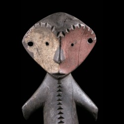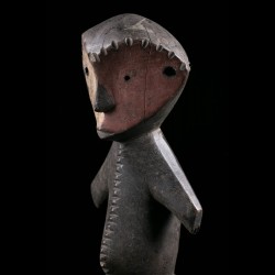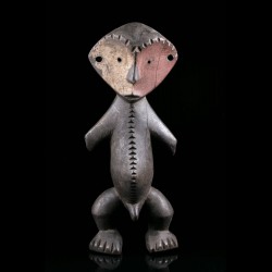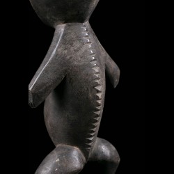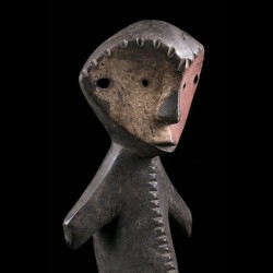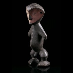 The Zande inhabit a large area which covers the northern part of the Democratic Republic of Congo, the Central African Republic and South Sudan. They developed a Kingdom based on a royal clan, the Vungara, and have absorbed foreign populations through their well organised army which conquered new territories. They are therefore composed of a very heterogeneous group. The Zande art is an art of the Court that is very similar to that of the neighbouring Mangbetu people. Both have a very refined visual style. Their various utilitarian objects are often surmounted by a carved human head that does not represent an ancestor. Their poets interpreted improvised songs accompanied by music played by harps with five strings usually toped with these finely sculpted heads. The closed brotherhood Mani or Yanda, who spread magic among its members and settled disagreements, produced highly stylized figurines both anthropomorphic and zoomorphic. Origin : private collection, BelgiumDating : 1960'sSize : 24 x 7 cm Material : wood