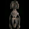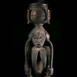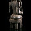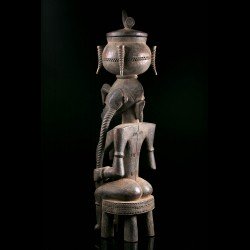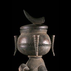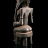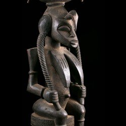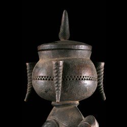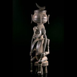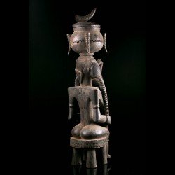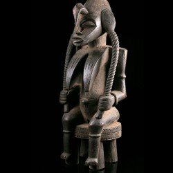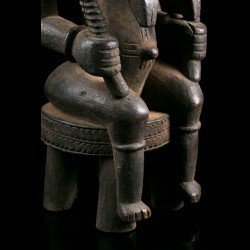 Sitting on a round seat, at the end or not of an iconic cane, she has the face carved in reserve, the curvilinear cheeks stretched towards the end of the chin. The half-closed eyes huddle in the eyebrows, the nasal bridge is straight, the mouth is barely outlined. The oblong breasts are high placed, stretched. The bust is classically arched. Bracelets are attached to the upper arms. Beautiful African figure with a remarkable patina sold by our art gallery.