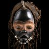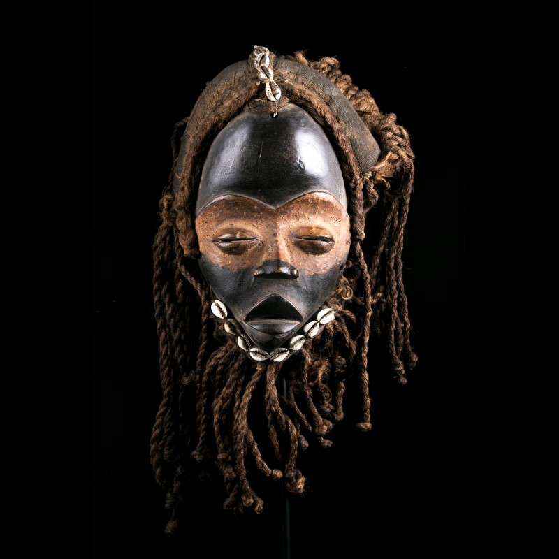 The almost closed eyes are embedded in a bright colored band as often seen on masks dan. The voluminous headdress is present. On observing small cowrie ornaments.
