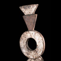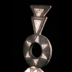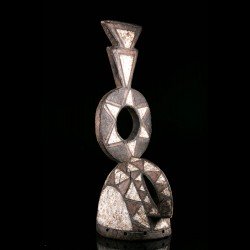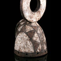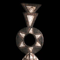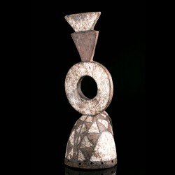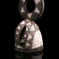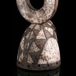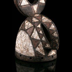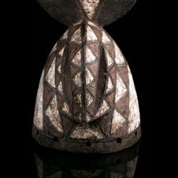 This authentic African mask of Wanluili type whose specific name is Nakomsougouri is quite stylized. Wanluili is a group of masks that gather under this generic term, and carry a beak, here strongly curved. This mask represents in this case the sacred sparrow among the Mossi, named Nakomsougouri. By gathering on the roof of the palace, the sparrows protect it. We observe a beautiful preservation of the geometric patterns, the polychrome and the beautifully worked blade that rises upwards.
