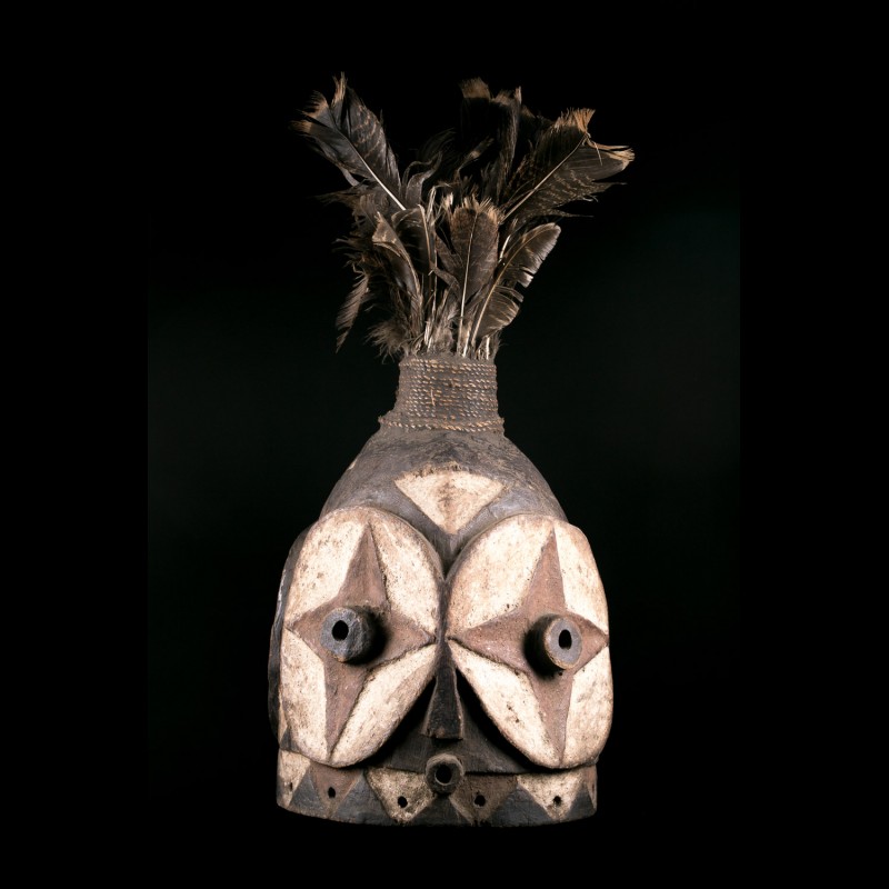 Among the Bembé, this helmet mask called Echwaboga, used in the Alunga society, embodies a spirit of the bush. It was kept in a cave and was only released during rites funerary or initiatic. Cylindrical helmet composed of janiform faces, with very large geometrical eyes representing those of the owl, totemic animal to which is dedicated the mask and the dance. The Echwaboga must harmonize the day-night duality, well-bad.