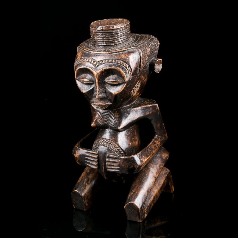 The most famous cuts are anthropomorphic, the face is treated as in royal statuary or on masks. The eyes are half closed like a coffee bean, the nasal bridge well defined and a fleshy mouth. The stylized hairstyle is finely sculpted, Kuba sculptors hate emptiness, so this pushes the artist to fully cover the surface, but all with great harmony and mastery.