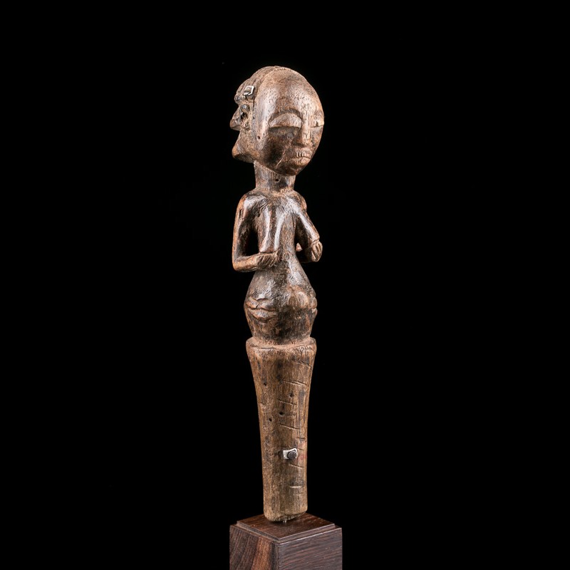 A carved staff top showing a beautiful patina and wear from age and much use. the figure is that of a female with the hair pulled back into three crests to the back of the head. The face is round and has large, closed eyes, small nose and large mouth with downward turning fleshy lips. The stomach is swollen representing pregnancy, and the arms are bent at the elbows with the hands supporting the large breasts. Below the large stomach is part of the shaft of the staff. Mounted on a custom made stand.