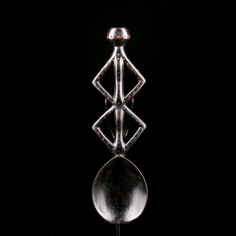Among these works of art, Kalukili spoons such as this one, sometimes in wood, sometimes in ivory or bone. It should be noted that the bone copies are less frequent because of their more difficult conservation. These spoons had only a ritual function within the Bwami, they are not objects with a practical daily role.