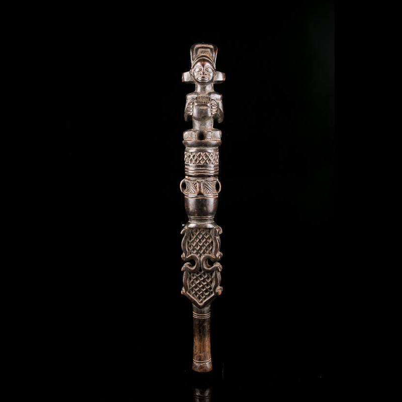 This remarkable scepter-snuffbox was the property of an important Mwananganga chief of the northern Chokwe. It belongs to the so-called "Moxico" style, identified by Bastin; very similar to that of the Royal Museum for Central Africa bearing the reference RG. 41233, collected at Sandoa in Congo. This type of prestigious traditional object was made to order from an experienced sculptor. This scepter was carried by a servant who preceded or followed the chief during his official movements. When the chief stopped, the servant planted the scepter in the ground.