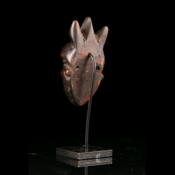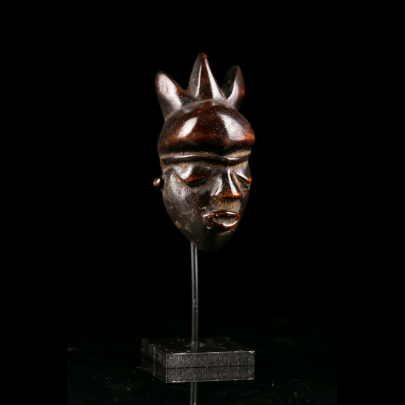 The tripartite crest, compact facial proportions, and tension of the lines give this piece a remarkable presence despite its modest size. Far from being anecdotal, this type of sculptural reduction required true technical mastery in order to condense, within only a few centimeters, the visual power of a full-scale ceremonial mask.